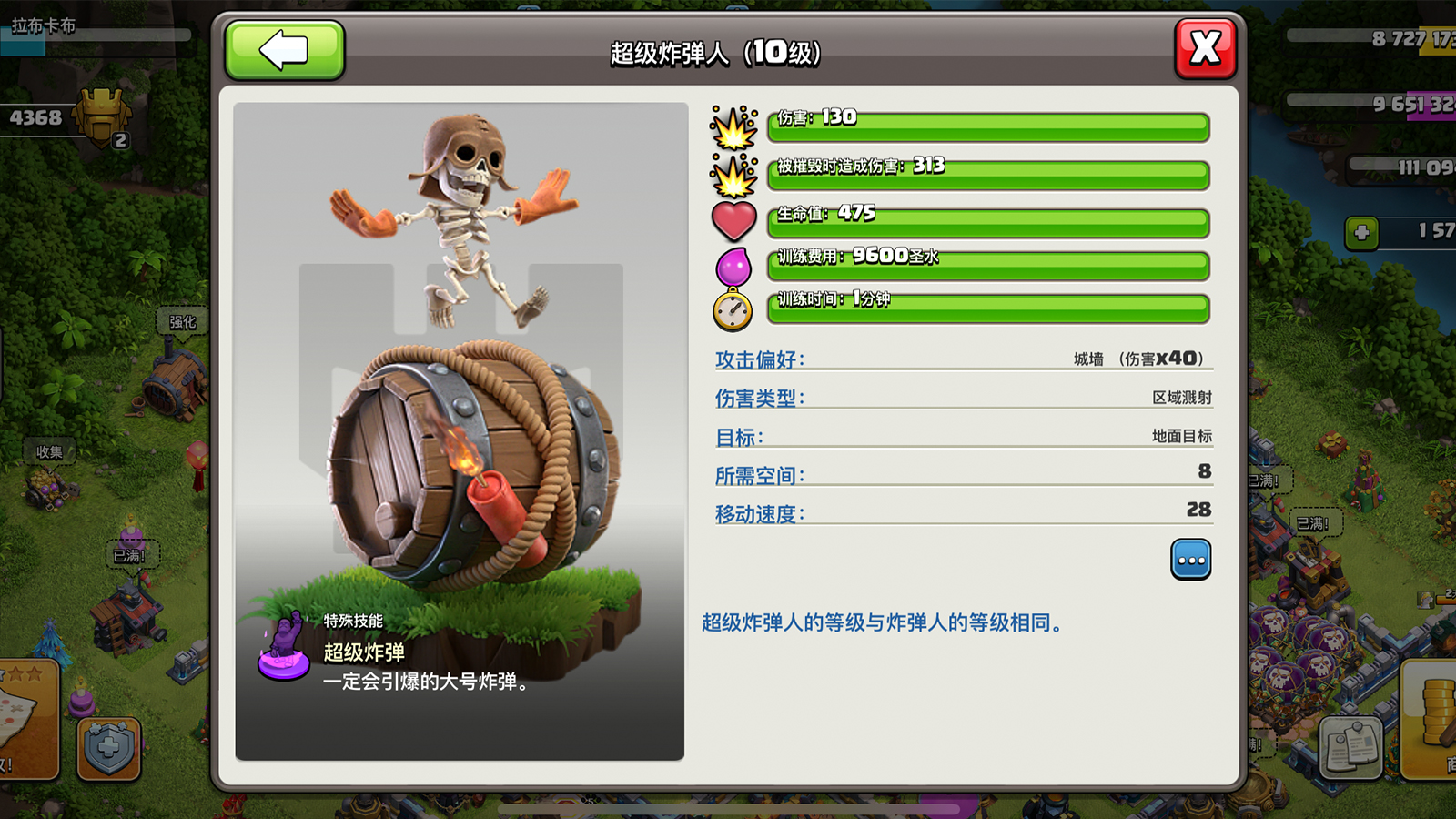 还在担心自己的大部队被城墙阻挡吗?那么解锁超级炸弹人就是首选兵种,毕竟在拆墙方面超级炸弹人具备一定的优势!