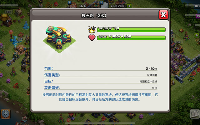 因为投石炮的显示秒伤非常低,但是在进攻方面具有高额伤害的群体攻击,而在进攻当中不仅兼顾陆地防御,而且空中防守也占据一定的优势,在防守方面可以轻松打出高额的爆发伤害来,无论是对于单个兵种来说还是对于多个兵种来说,投石炮都具有一定的话语权,所以在一定程度上投石炮也能担任最强建筑的称号,不过让人遗憾的是一个阵型当中只存在两个投石炮,这就降低了投石炮的威胁!