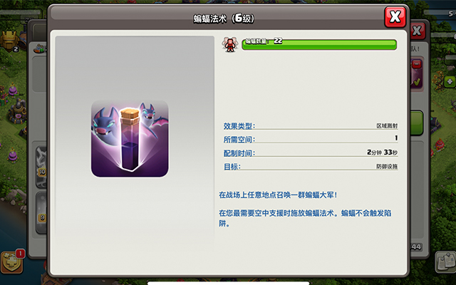 因为蝙蝠法术召唤的蝙蝠数量虽多,但极其脆弱,特别是具有群体伤害的建筑,极其针对蝙蝠法术!而蝙蝠法术一级的时候只能召唤7个小蝙蝠,但是到了6级却可以召唤22个小蝙蝠,多个蝙蝠蝙蝠法术放在一起可以轻松组成一个蝙蝠大军,凭借着2秒一次的攻击和56的移动速度可以快速帮助大部队推进,而配置单位只有一个,可以以极小的法术空间增加部队的进攻,也正是因为如此蝙蝠法术从12本开始彻底崛起!