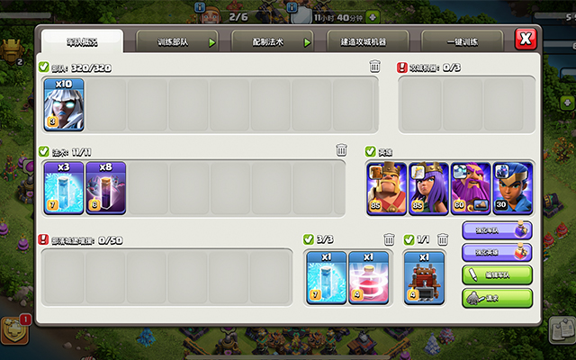 其中在选择蝙蝠法术释放地区的时候尽可能规避掉群体伤害较为密集的区域,在大部分建筑锁定大部队以后释放蝙蝠法术,而后引导蝙蝠大军进入阵型内部进攻,时刻把握冰冻法术防止蝙蝠法术被群体伤害建筑快速打掉,而后咏王技能也是蝙蝠法术进攻的一个小细节,可以在几秒内保证蝙蝠大军不受伤害,从而无伤进攻群体伤害较为密集的区域,而后是转场法术的释放,在完成进攻任务以后尽可能收集主力,而后作为收尾兵种来使用!