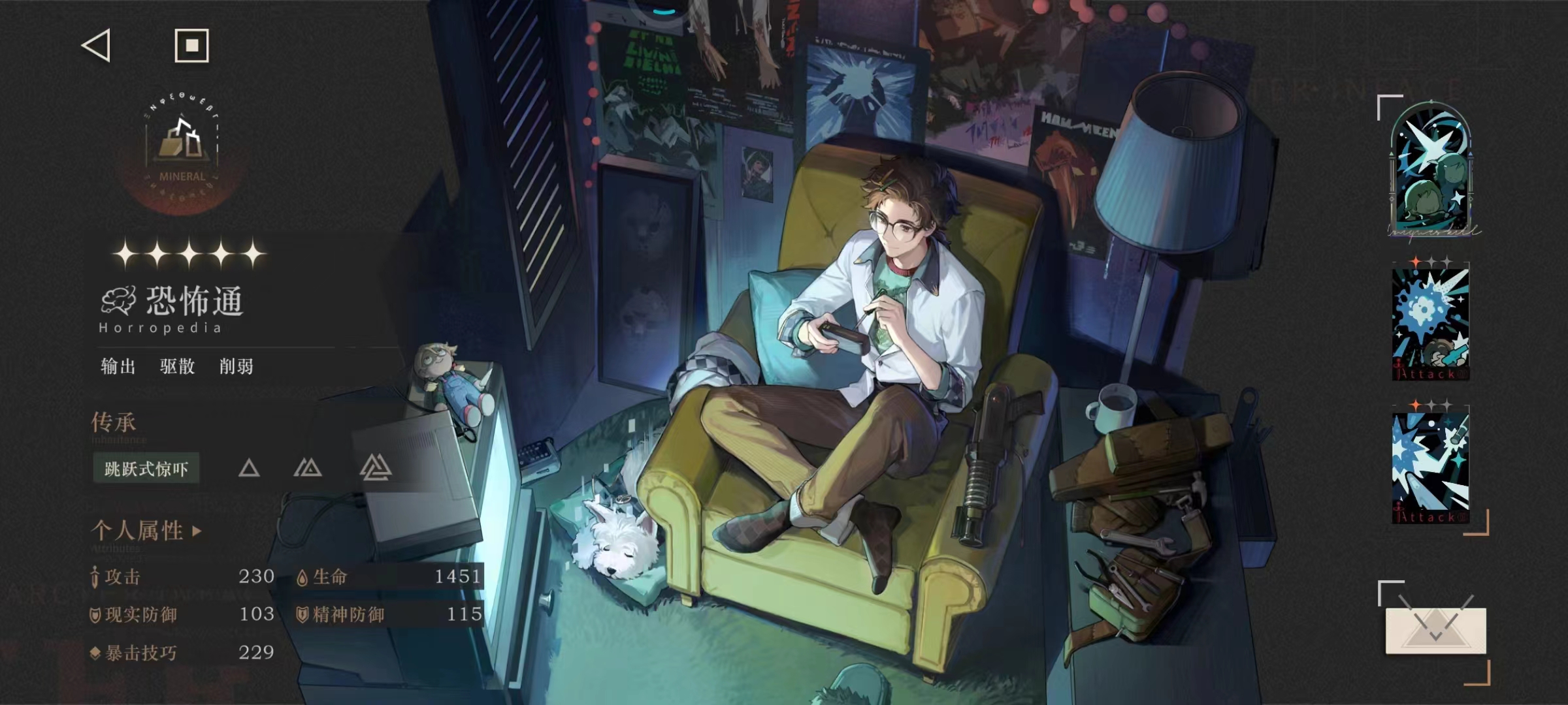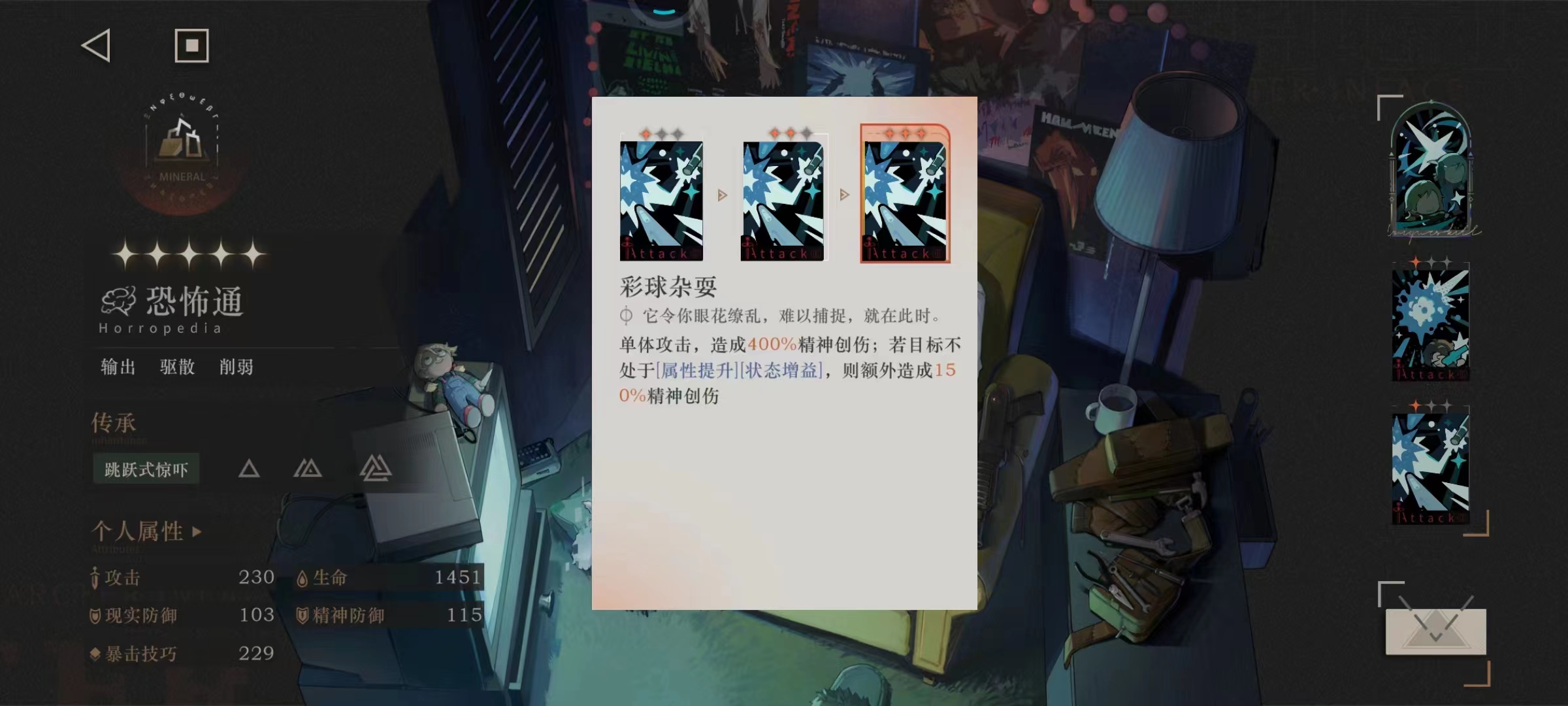 总结看下来,恐怖通的技能机制完整,三个技能相互搭配可以打出高额伤害,相互之间也有联动,但是洞悉传承一二有点不合时宜,与自己的技能联动关系几乎没有,且把驱散全部关联到一技能逻辑使然上面,让自己的驱散效果大打折扣。尤其是浪费了一个洞悉传承,无论是伤害的提升和驱散的额外效果,都需要留牌升星,这样会导致在实战中技能卡手,一星技能卡吃不到洞悉一和三的效果加成,二星有需要合成,可能五星角色在机制配比上就会缺少一些,不然无法彰显出六星角色的重要性。
