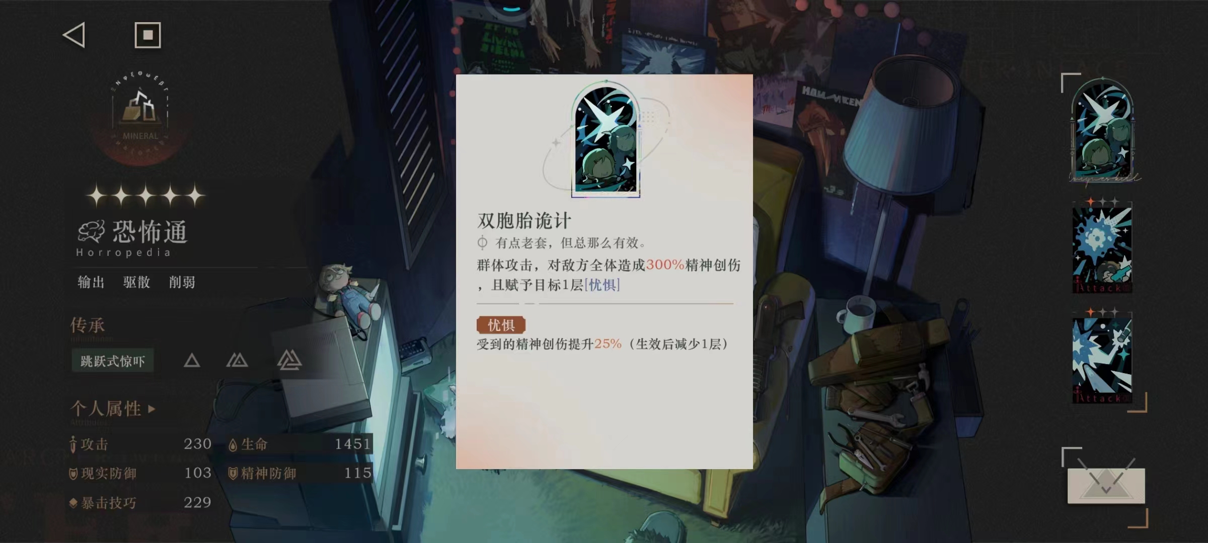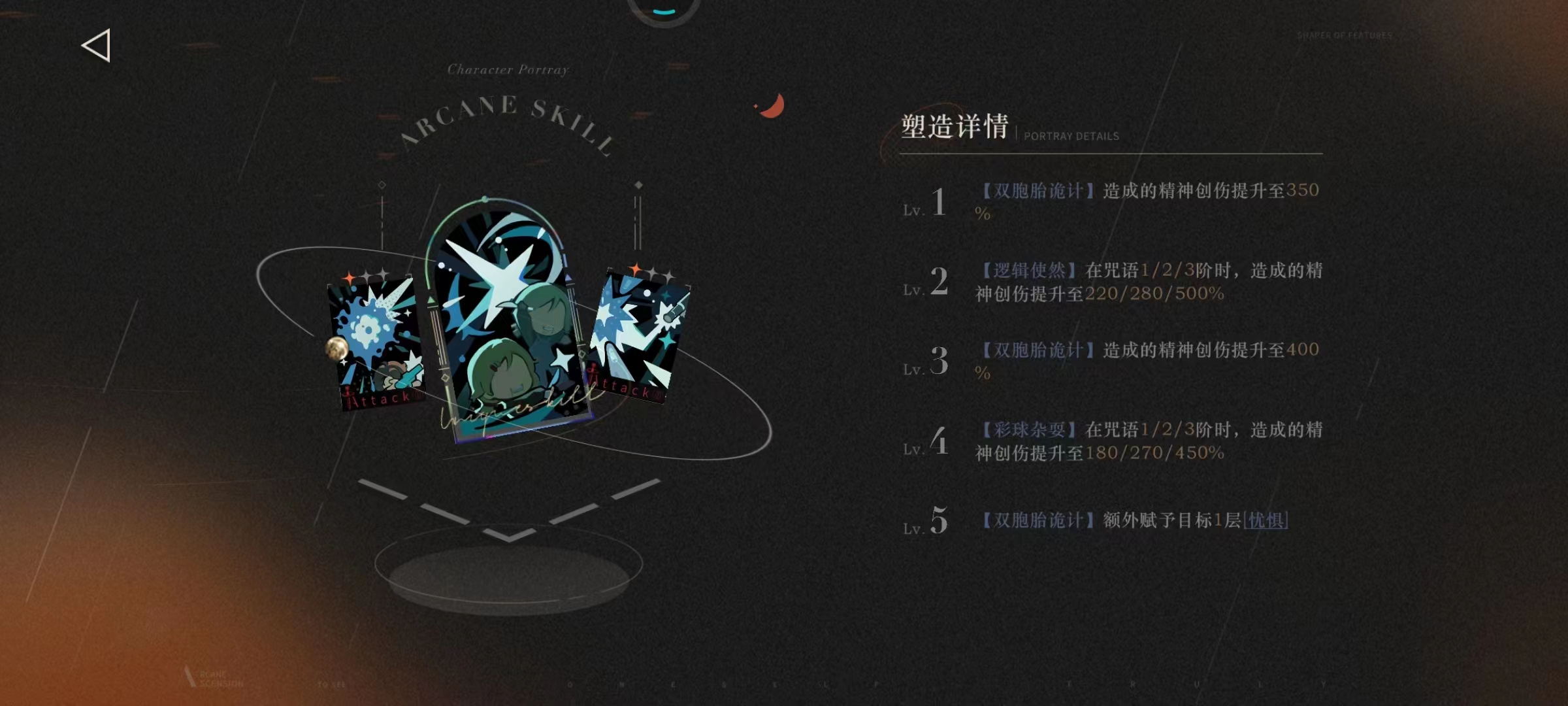 二技能彩球杂耍,单体攻击造成160%的基础伤害,若目标不处于属性提升和状态增益则额外造成60%的精神创伤,而三星卡无特殊效果,伤害提升到240%,400%,额外伤害提升到90%,150%,很明显逻辑使然和彩球杂耍是一套组合技能,先用逻辑使然驱散他们的属性增益和状态增益,接着彩球杂耍完成额外伤害加成,打出高额伤害完成斩杀。而至终的仪式,双胞胎诡计,群体攻击,基础伤害300%,额外赋予敌方一层忧惧,受到的精神伤害提升25%,也可以加到组合技能里面去,整体三个技能相互搭配组合可以造成高额伤害。