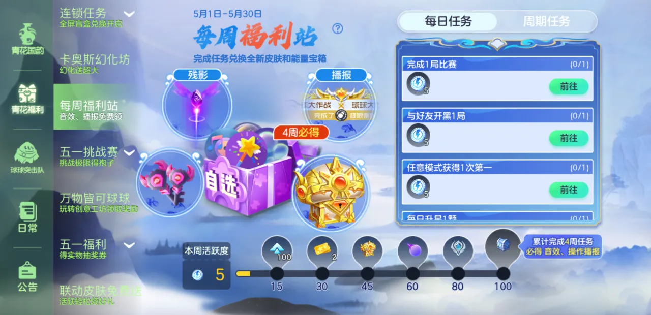 5月10日-5月16日,完成任务,累积能量,领取好礼!每日能量站活动来袭~完成任务获取能量即可领取每周周宝箱、诸神珍宝箱等超值奖励,开启每周周宝箱即有机会获取音效自选包、操作播报等惊喜好礼!快来能量站完成任务领取好礼吧~