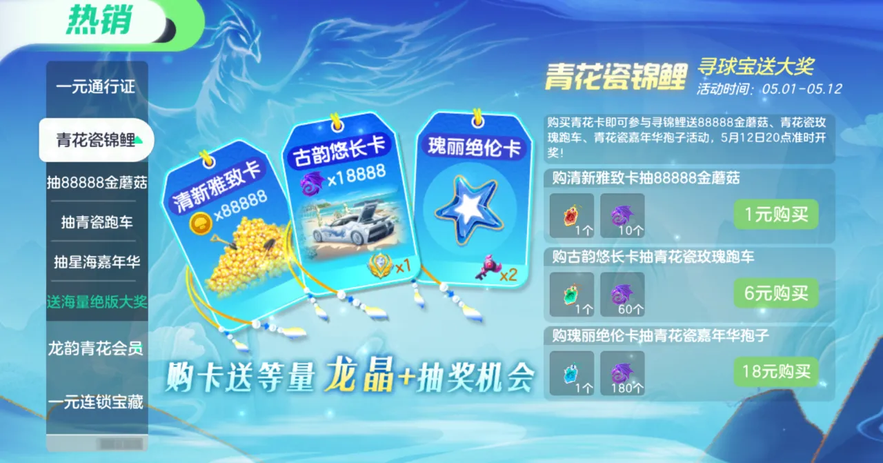好运福袋:88888金蘑菇,幸运福袋:青花瓷玫瑰跑车,鸿运福袋:青花瓷限定嘉年华孢子「星海·嘉年华」,3种福袋限时购入,3项大奖等你来赢!快来试试自己的手气,获取青花锦鲤的祝福吧~