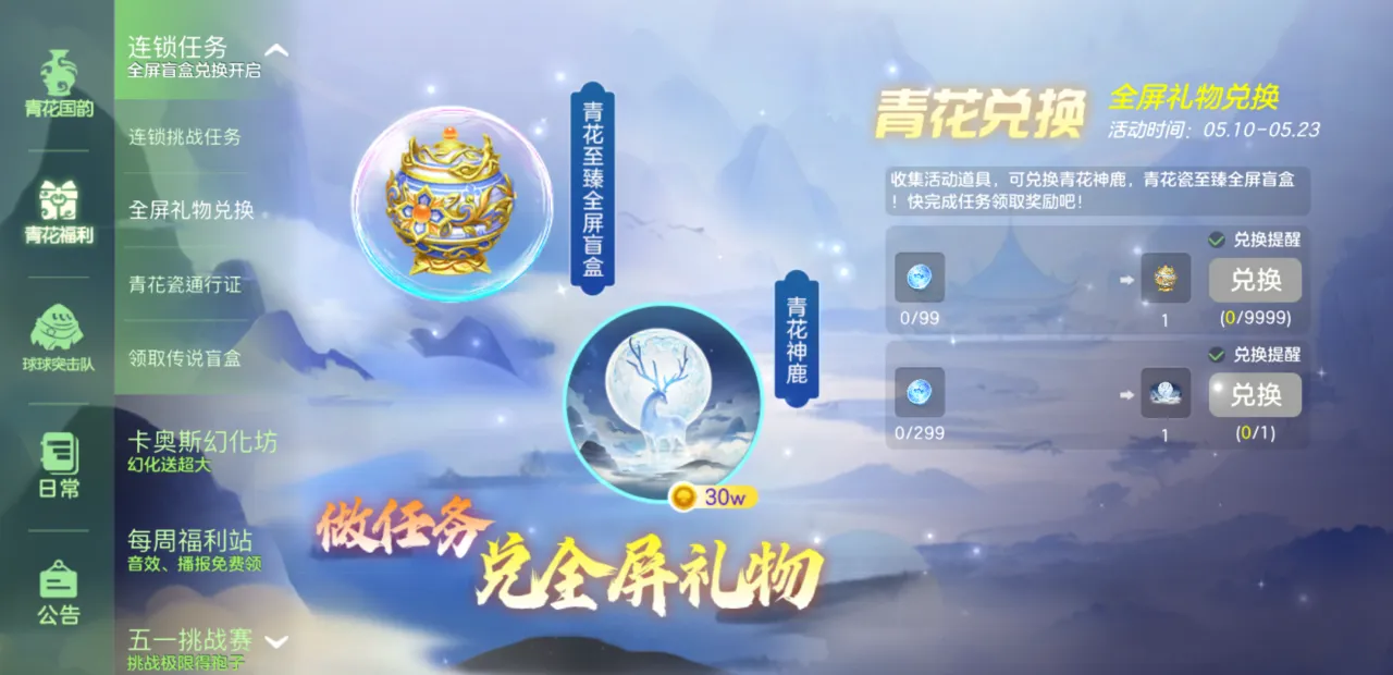 5月10日-5月23日,青花瓷联动专属连锁任务限时开启!完成阶段任务,收集任务材料,领取惊喜宝箱,兑换海量道具!四塔步数,青花瓷传说盲盒等海量超值好礼享不停!18元开通额外收集任务还可领取价值272元的超值奖励!还有联动限定礼物「青花神鹿」、青花瓷全屏盲盒等惊喜好礼等你来换!