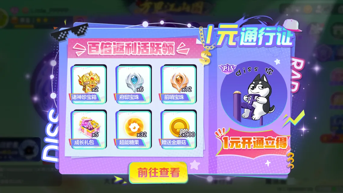 5月10日-6月9日,每日登录,好礼相赠~1元通行证携超值福利上新啦,仅需1元即可解锁进阶福利!炫光「diss你」、典藏孢子、超大奇妙宝箱钥匙等超值奖励等你来领!