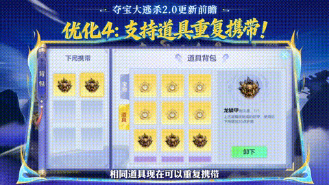 打破限制!道具可重复携带!想开局套多重无敌盾?或是极限移速?夺宝大逃杀2.0满足球宝!自由组合最强装备流派,打造你的无敌配置!