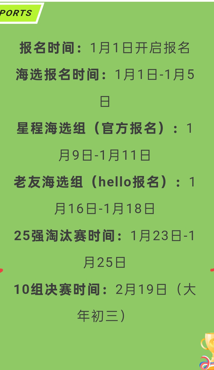 本届赛事分为星程海选组、老友海选组。俗话说:“赛道选的好,冠军少不了”。球宝们可以结合自身实际情况选择不同的赛道,进行报名参赛哦~