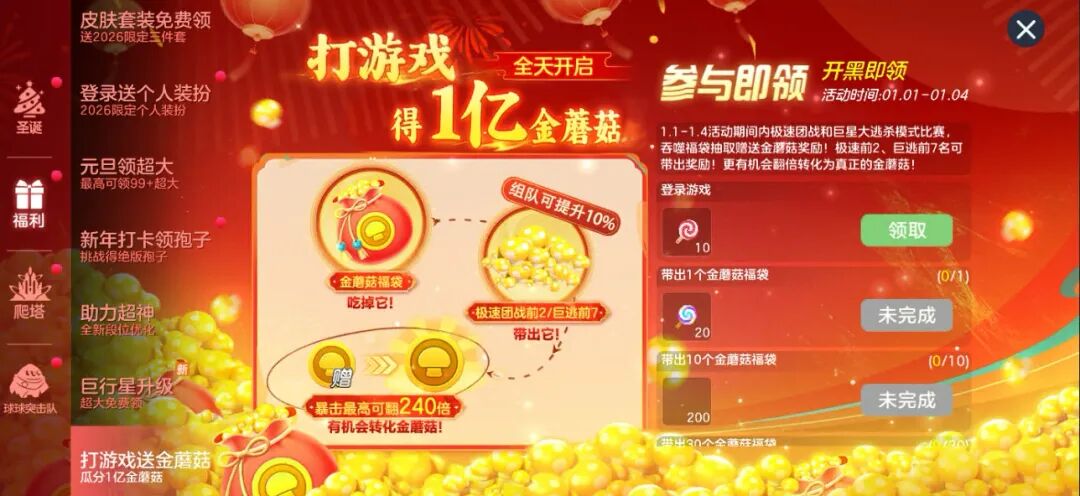 元旦狂撒1亿金蘑菇,1.1-1.4 打游戏掉金蘑菇全天开放!组队可提升10%,叫上球搭子瓜分泼天富贵!