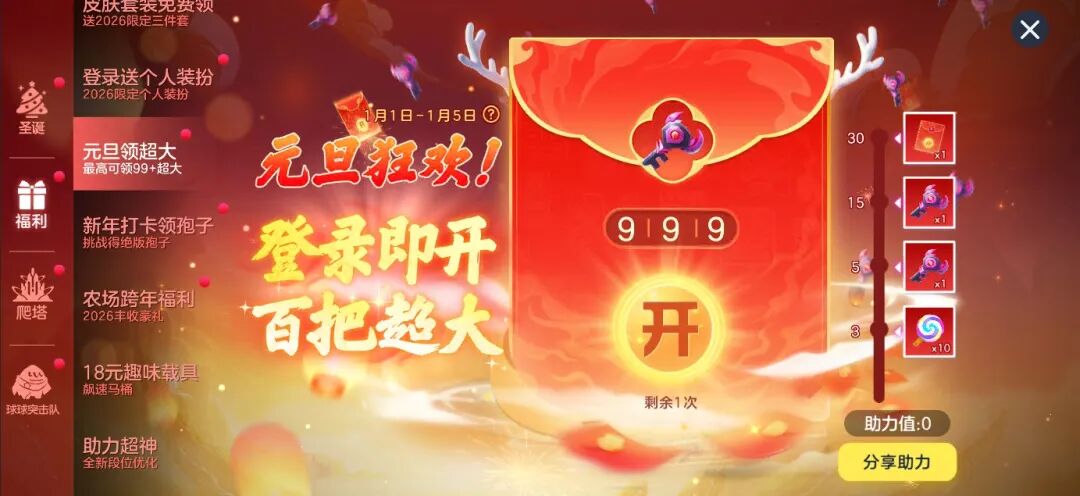 元旦超大钥匙狂欢开启!1月1日-1月5日,登录即开!百把超大等你领!邀请好友助力,抱走更多奖励!