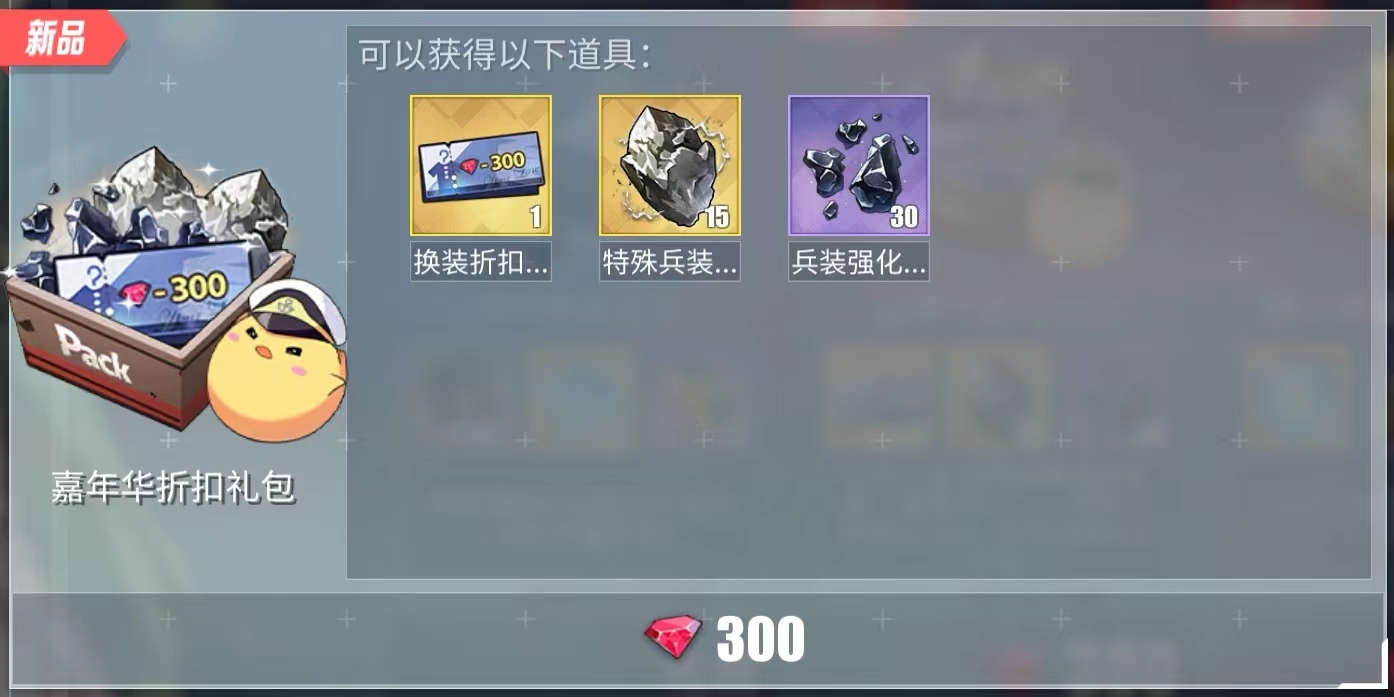 购买后可获得「换装折扣券(嘉年华)」×1、特殊兵装核心×15、兵装强化石T2×30;