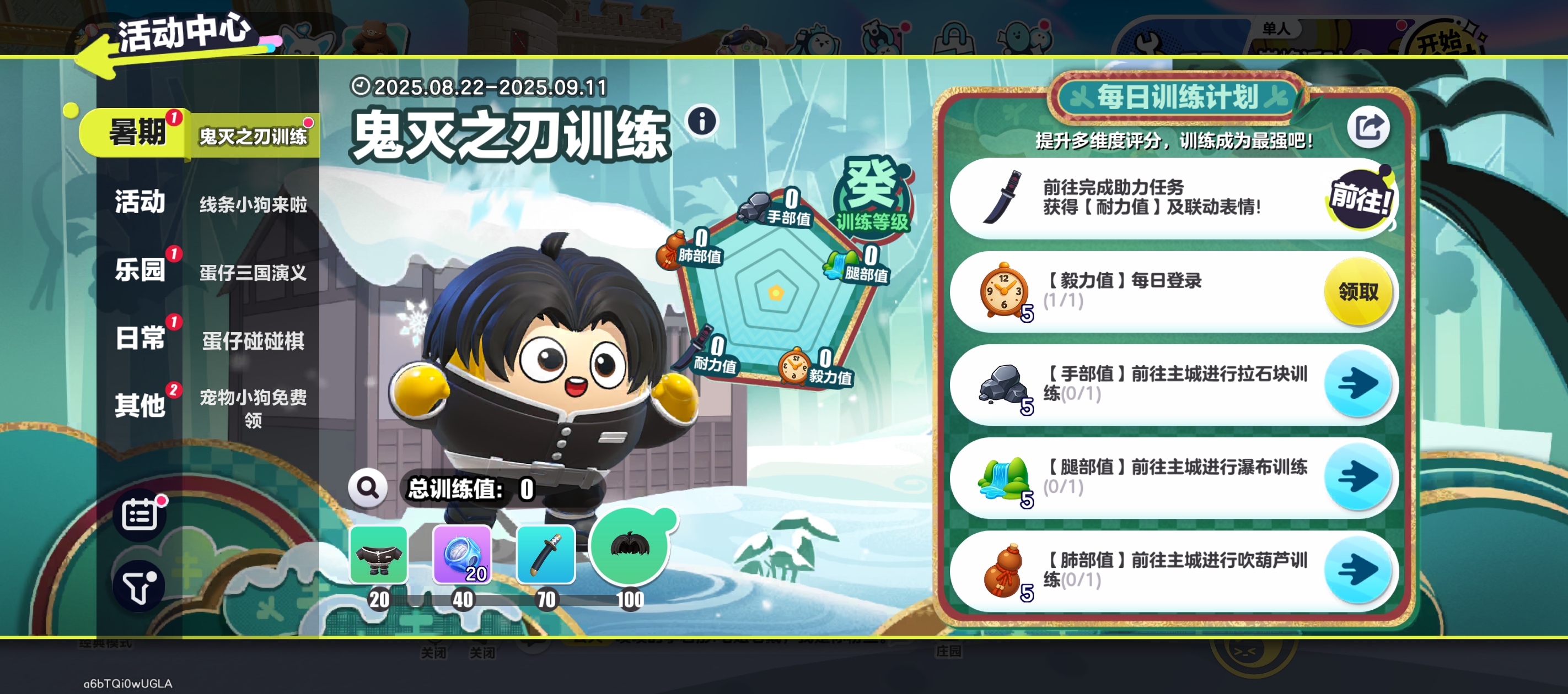 活动内容:鬼灭之刃训练活动来袭!活动期间完成任务,即可增加五维图对应各项维度的训练值。训练值总值达到指定数量后,即可免费领取鬼灭之刃联动外观套装、配饰等奖励。快来参与训练成为最强蛋仔吧!