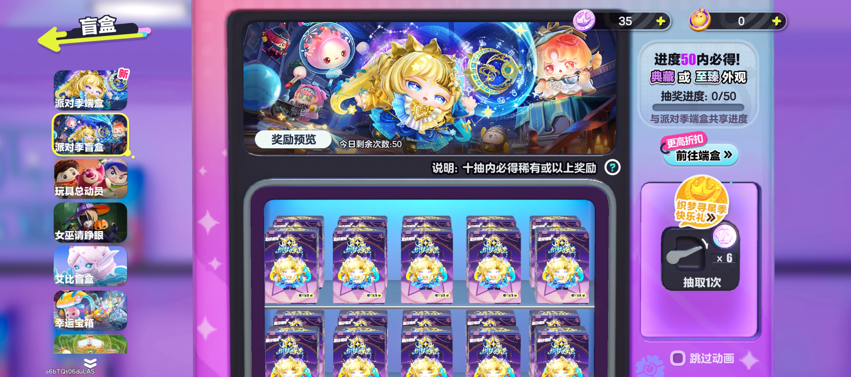 派对季期间,在派对季盲盒中首次获得任意非隐藏款典藏或非隐藏款至臻盲盒时,下次端盒可享受5折优惠!