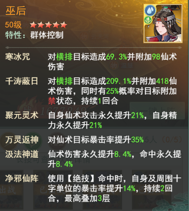 巫后五手放9号位,巫后技能对横排造成伤害,并有几率对目标附加禁,使其不能放大,这个站位可以清掉右边2手武林人士之后,继续打到最后一排武林人士,且使用绝技命中时,可以提高己方十字单位伙伴的暴击率,从而打出更高的伤害。