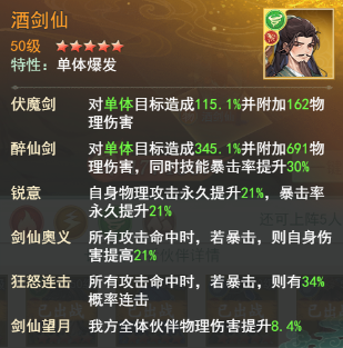 酒剑仙放7号位,酒剑仙单体高爆发强力伙伴,对单体目标造成高额伤害并且使用大招时,技能暴击率提升30%,在攻击命中时,若暴击时有34%概率连击,酒剑仙被动给己方全体伙伴提升8.4%的物理伤害,提高了全体物理伙伴的输出。
