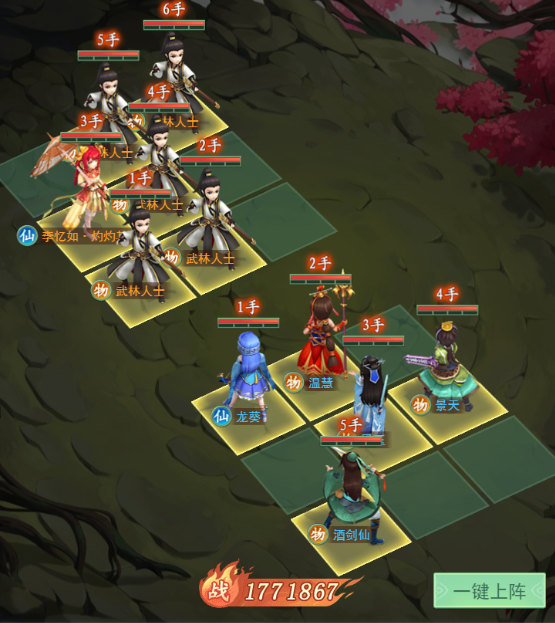 龙葵一手放1号位,龙葵绝技对敌方单体造成高额伤害并且有80%概率对目标附加定状态,配合同列酒剑仙清理掉敌方1手武林人士,可直接打到李忆如身上,使李忆如眩晕无法出手。