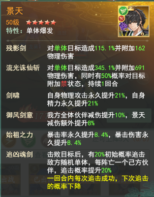 景天放6号位,景天上阵可给全体伙伴增加10%减伤,为自己提升8%减伤,大大提升了队友的存活率,在压低敌方6手武林人士血条的同时,配合温慧有20%概率收割敌方剩余随机单体。
