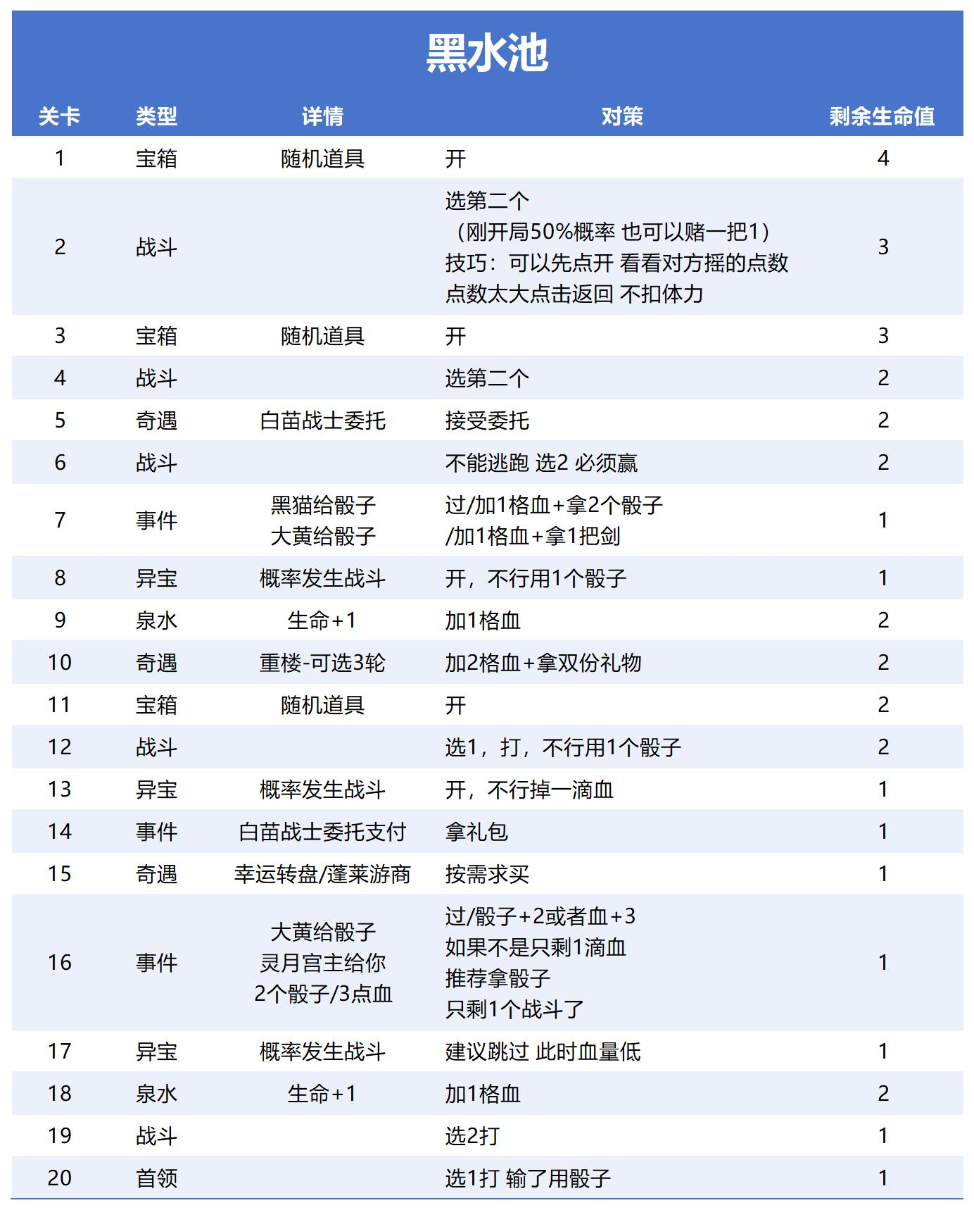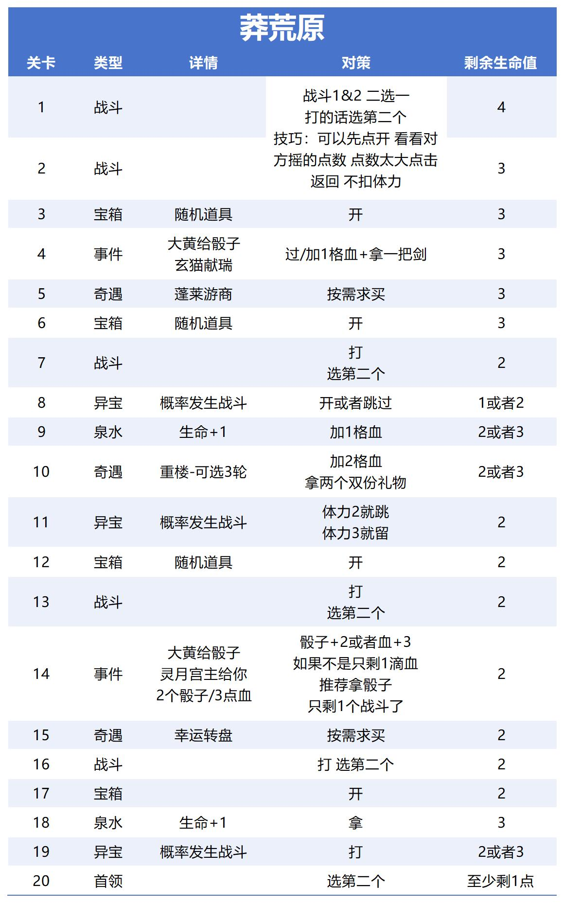 4.秘境地图【莽荒原&黑水池】最后一个事件有可能会遇到——【灵月宫主】,她会给你两个选项(骰子+2或者体力+3),如果不是只剩1滴体力的话,推荐拿骰子——因为后面只剩1个战斗;