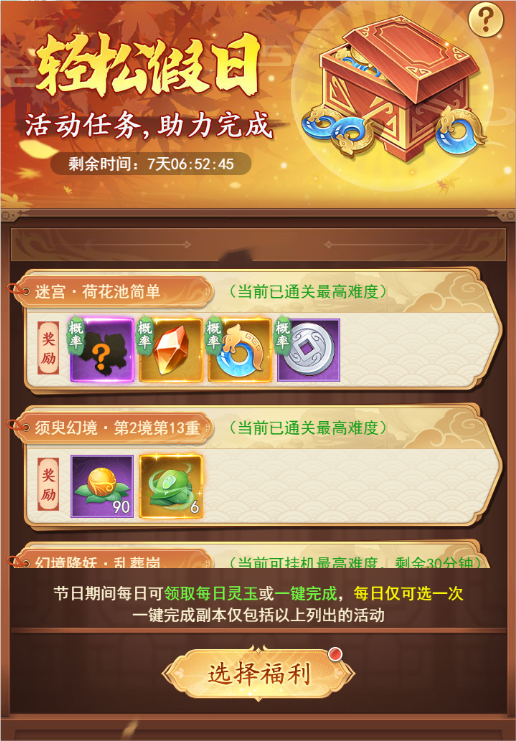 假期不内卷!活动期间玩家可选择一键完成【迷宫】【幻境除妖】【须臾幻境】【蛊母培育】【蛊母传闻】【海外仙山】等玩法,假期轻松护肝。
