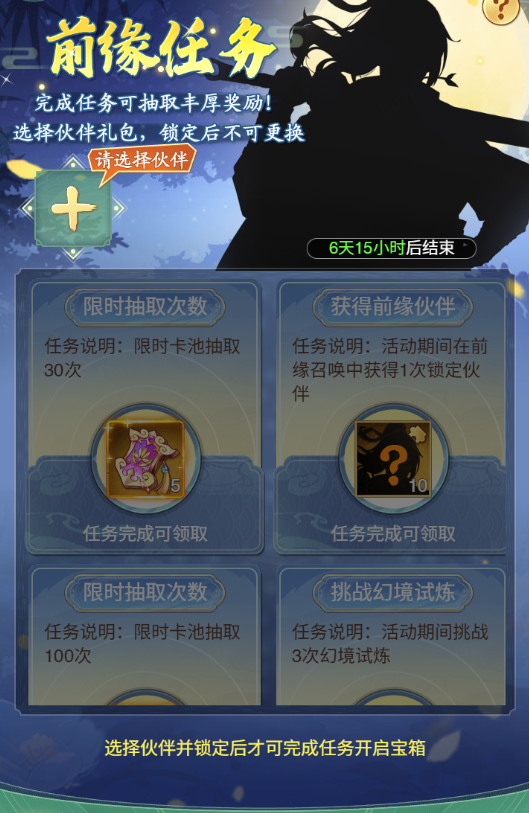 活动期间在本次限时招募伙伴中选择一位锁定,锁定后完成任务可获取丰厚奖励!奖励包括【前缘仙令】及【指定伙伴碎片】。