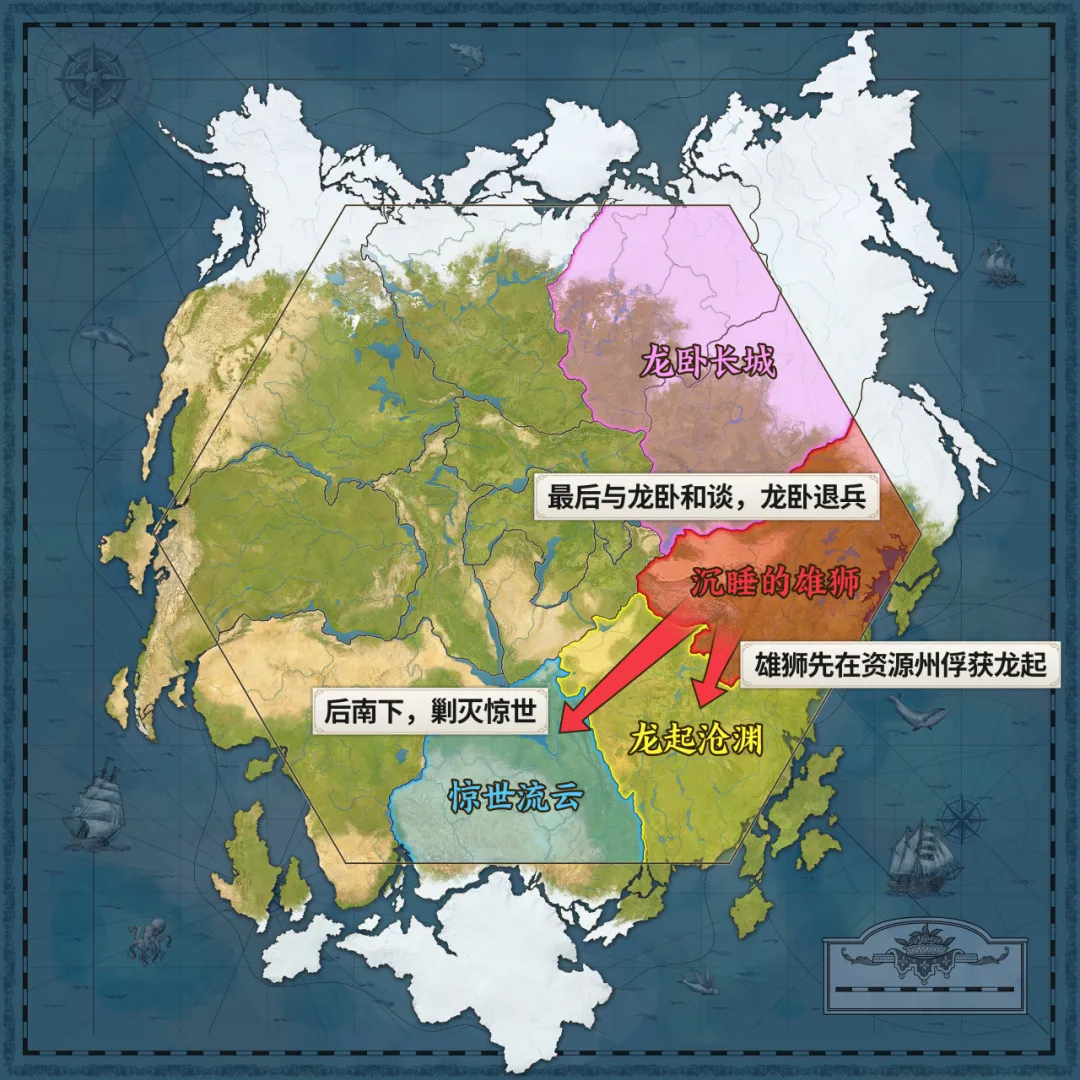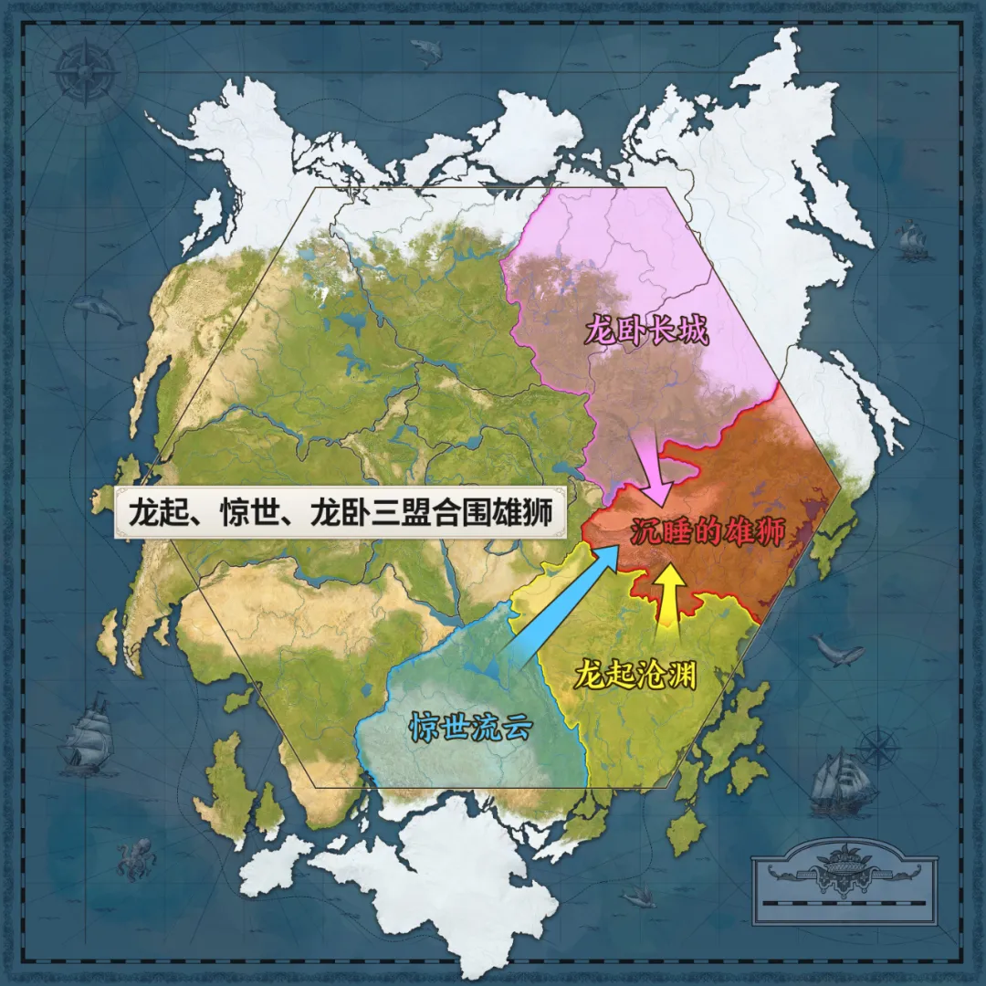 大家知道世界启元它是有一个地缘战略的,你的主城离我八丈远,你不管是调度还是补给非常慢,你跨州打我家门口是非常难的。当我把龙渊打掉后,长城就觉得跨州打不靠谱,直接撤掉了。最后我腾出手,把最后一家惊世也打掉了。