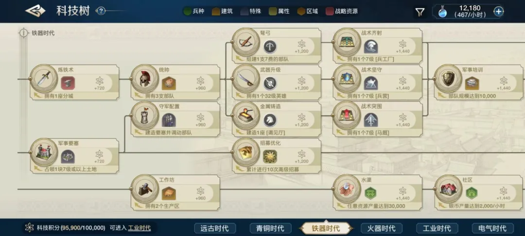 个人科技也一样,你是先把图书馆点起来,然后去攀科技攀兵种,还是说先攀资源,先把兵营点起来,这些都是决策点。目前我自己玩下来,会选择先攀科技,我觉得世界启元对于科技的这个重视度,要比其他游戏要更高一些,因为它挂钩是兵种属性,以及后面更多高级的土地之类的。