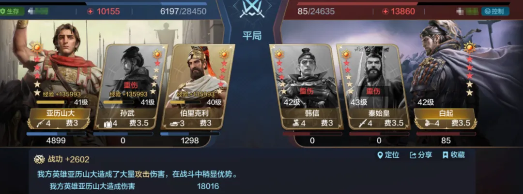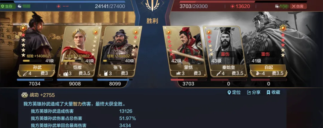 我军全体累计造成5次伤害时,使我军随机1名英雄对敌军随机1名英雄造成1次伤害(伤害率40%→80%,伤害类型由造成伤害英雄的攻击、智力属性较高者决定)。我军全体累计受到5次伤害时,立即为我军伤兵最多的单位恢复一定兵力(恢复率40%→80%,受智力属性影响)。且使其下1次受到的伤害降低(战时)10%→20%(受智力属性影响)。