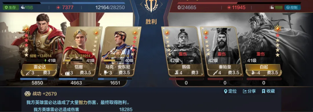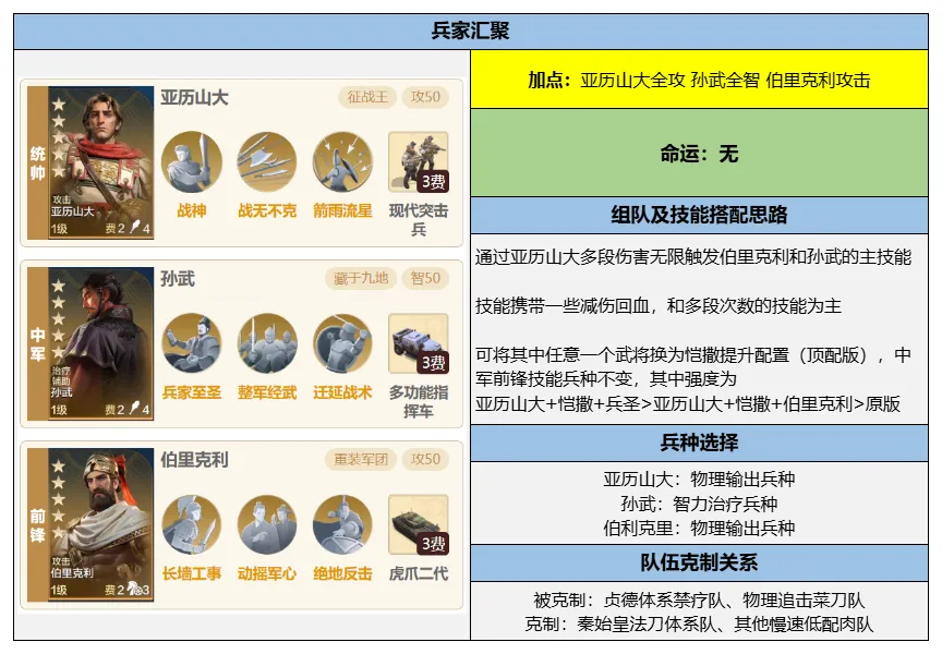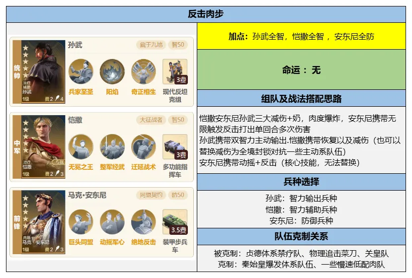 适配体系:慢速步兵体系,可搭配多次受伤和多段造成伤害触发被动,如恺撒、马克·安东尼、伯里克利、雷必达、哈兰德。