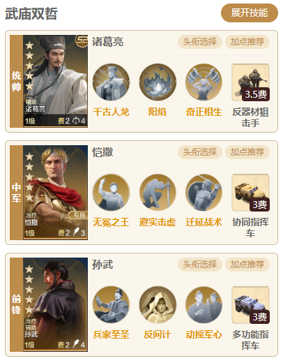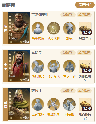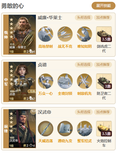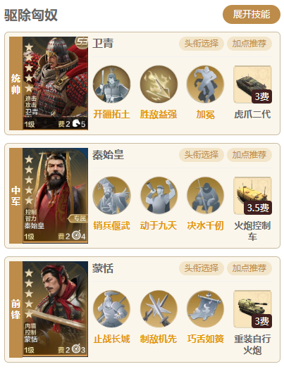 技能点评:最适配卫青的一个输出追击。搭配理查一世+腓特烈也不错,胜在稳定。