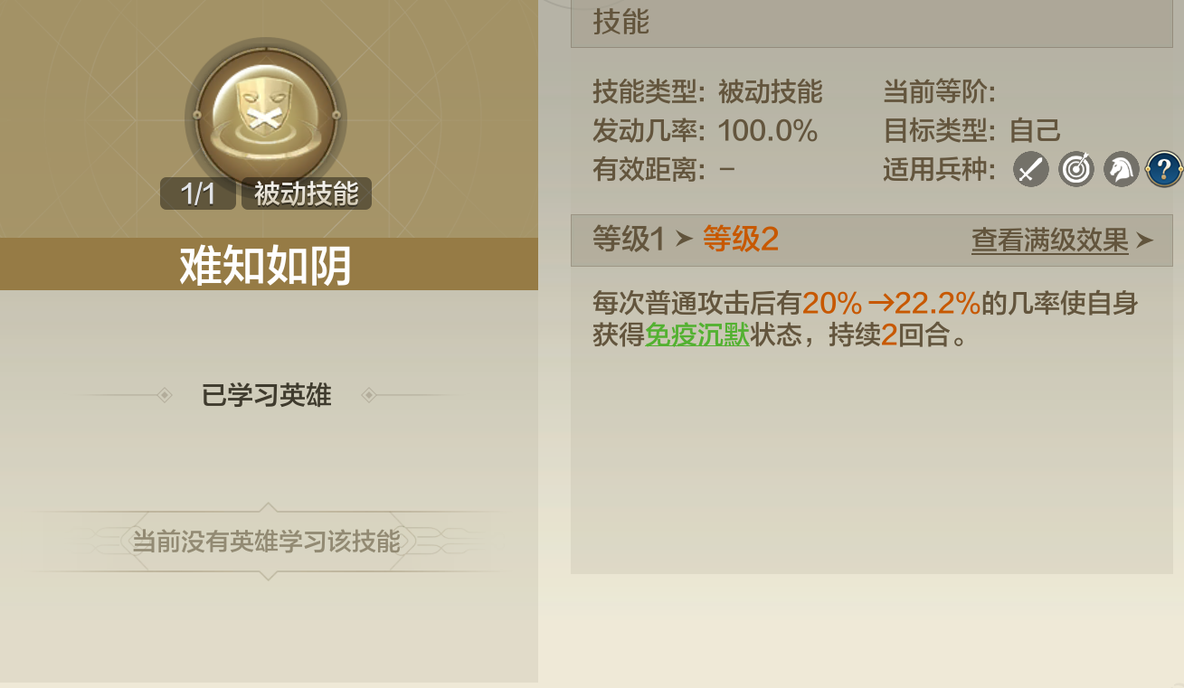 技能描述:每次普通攻击后有20%-40%的概率使自身获得免疫沉默状态,持续2回合。