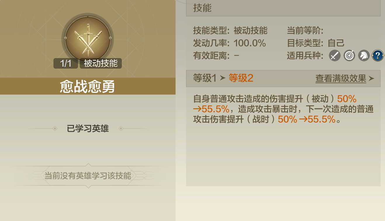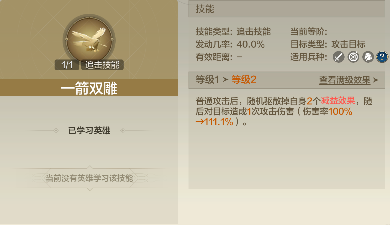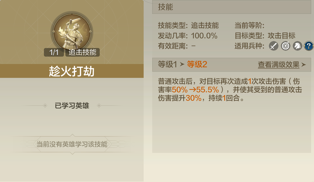技能描述:普通攻击后,对目标再次造成一次攻击伤害(伤害率50%-100%),并使其受到的普通攻击伤害提升(战时)30%,持续1回合。