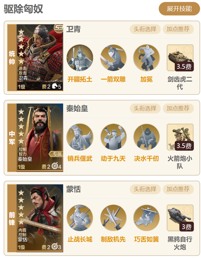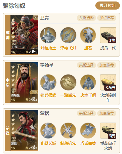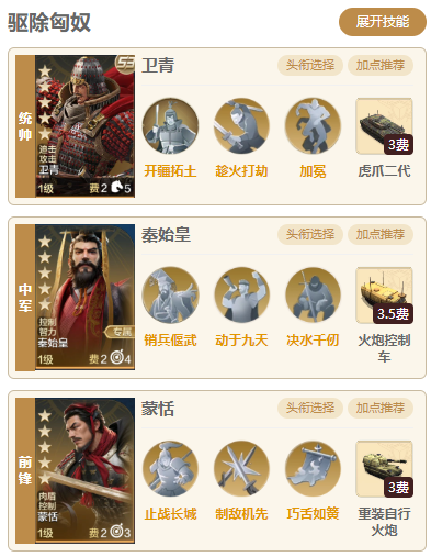 2、卫青队伍优选趁火打劫和一箭双雕(输出),其次可选胜敌益强(免控)。一骑当千可替代动于九天稳定替卫青增伤。