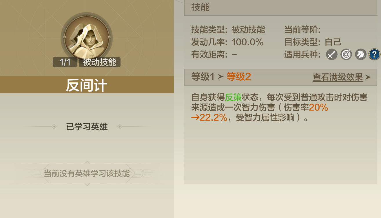 技能描述:自身获得反策效果,每次受到普通攻击时对伤害来源造成一次智力伤害(伤害率40%,受智力属性影响)。