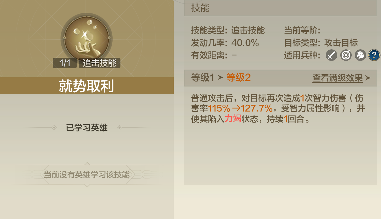 技能点评:目前最适配的应该是骑兵智力追击,能频发触发,吉尔伽美什和伊丽莎白一世。非骑兵追击触发频率不够容易不能力竭多人。