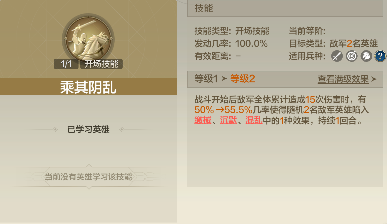 技能描述:战斗开始后敌军全体累计造成15次伤害时,有50%-100%几率随机2名敌军英雄陷入缴械、沉默、混乱中的一种效果,持续1回合。
