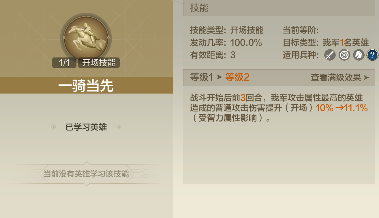 技能描述:战斗开始后前3回合,我军攻击属性最高的英雄造成的普通攻击伤害提升(开场)20%,受智力属性影响。