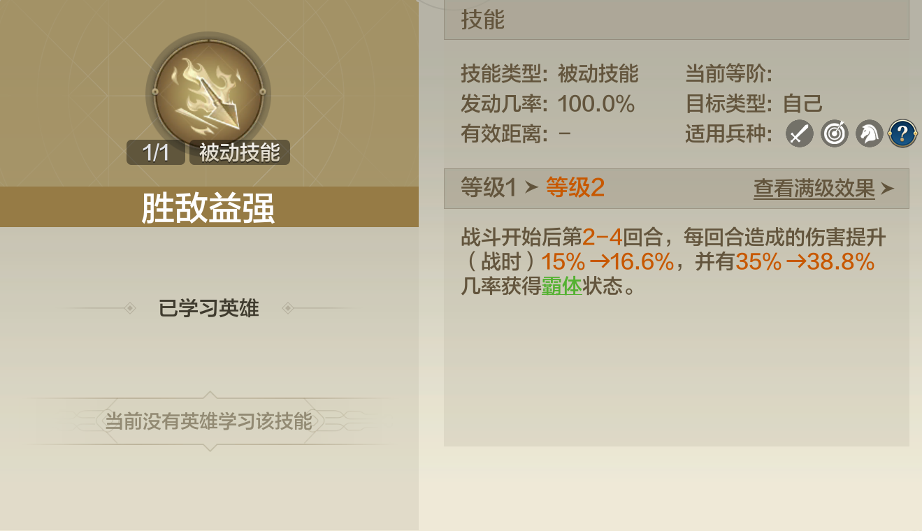技能描述:战斗开始后第2-4回合每回合有70%概率获得霸体状态,此期间造成的伤害提升(战时)30%。