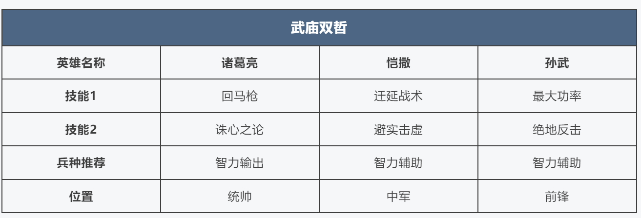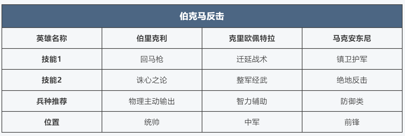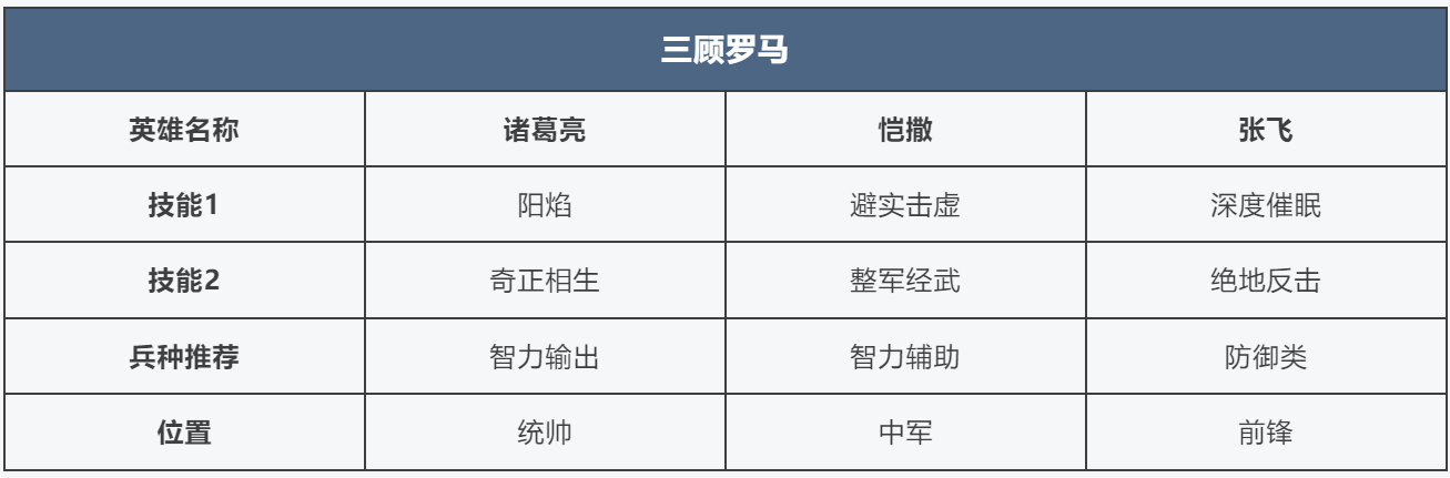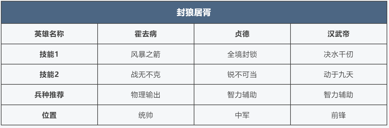 技能点评:主动体系的辅助神技,适配各种主动英雄,尤其是类似于关羽、霍去病等超高爆发,唯一问题可能比较怕技能效果加不到核心人员身上,且该技能能极大的克制反击队伍。