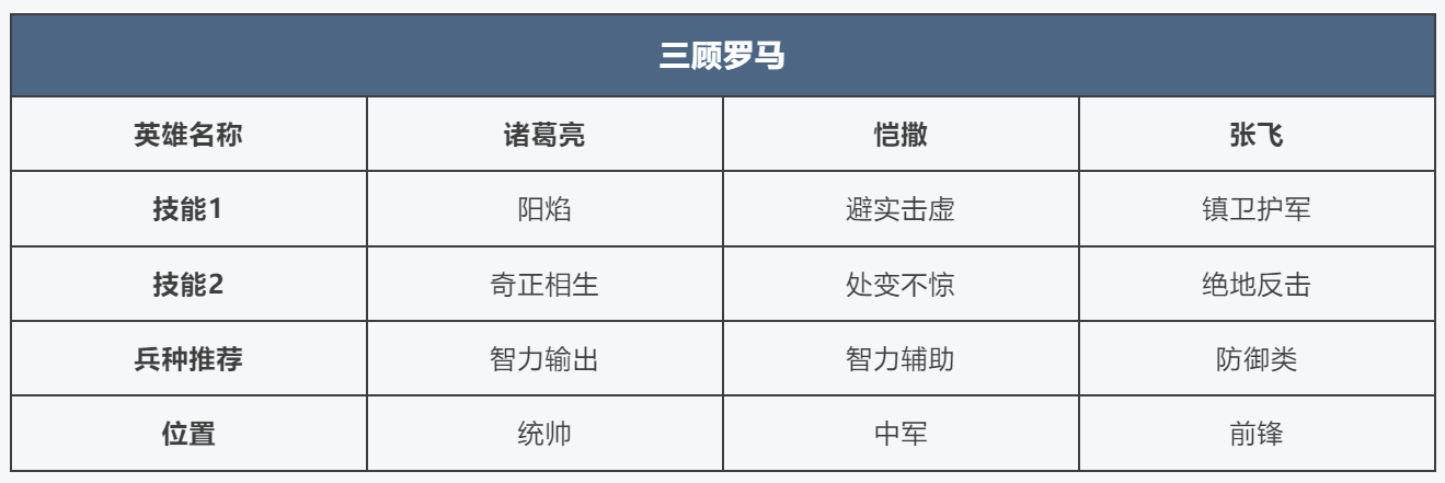 技能效果:我军3名英雄兵种全不相同时,统帅英雄普通攻击距离+1;中军英雄受到的伤害降低(开场)10%;战斗开始后前3回合,前锋英雄保护全体友军。
