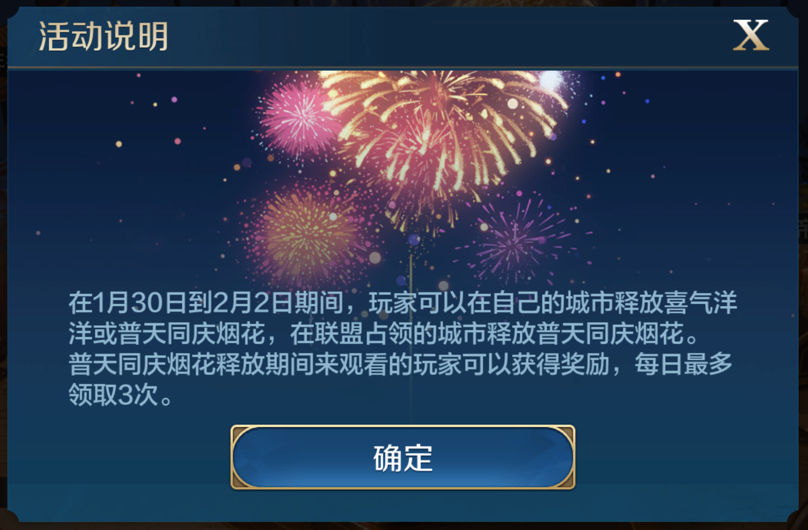 在活动期间内,开拓者们可以在自己联盟占领的城市释放烟花,释放烟花时不仅可以获得高级招募令x2的奖励,观看烟花的“吃瓜群众”们,每次观看也可以获得最高100金币的观看奖励,每日最多可获得3次。
