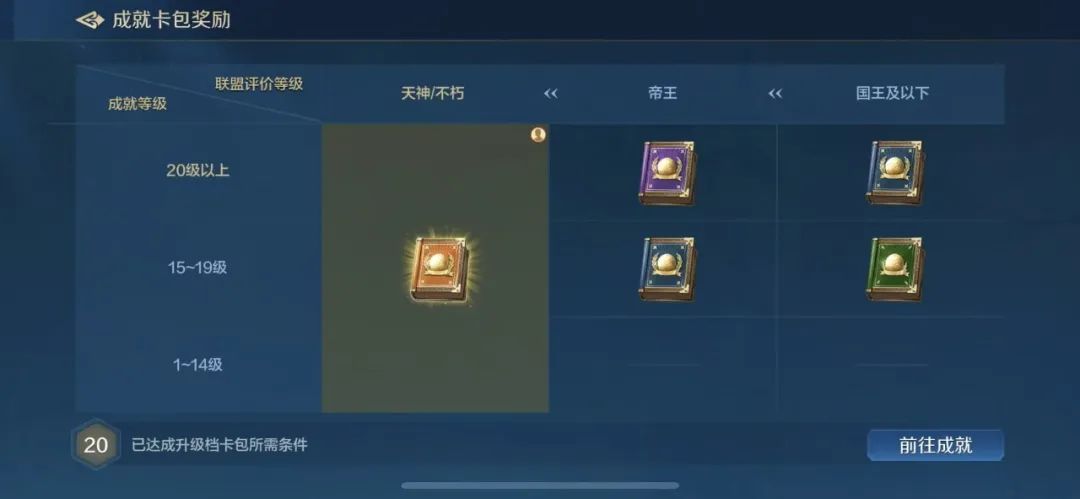 开拓者个人通过点击【成就卡包】查看自身的成就等级,成就等级越高,即可获得对应联盟评级的评价奖励。如个人成就等级在20级及以上,且联盟评价为天神/不朽,那么在结算时,开拓者个人将获得封冕卡包奖励。