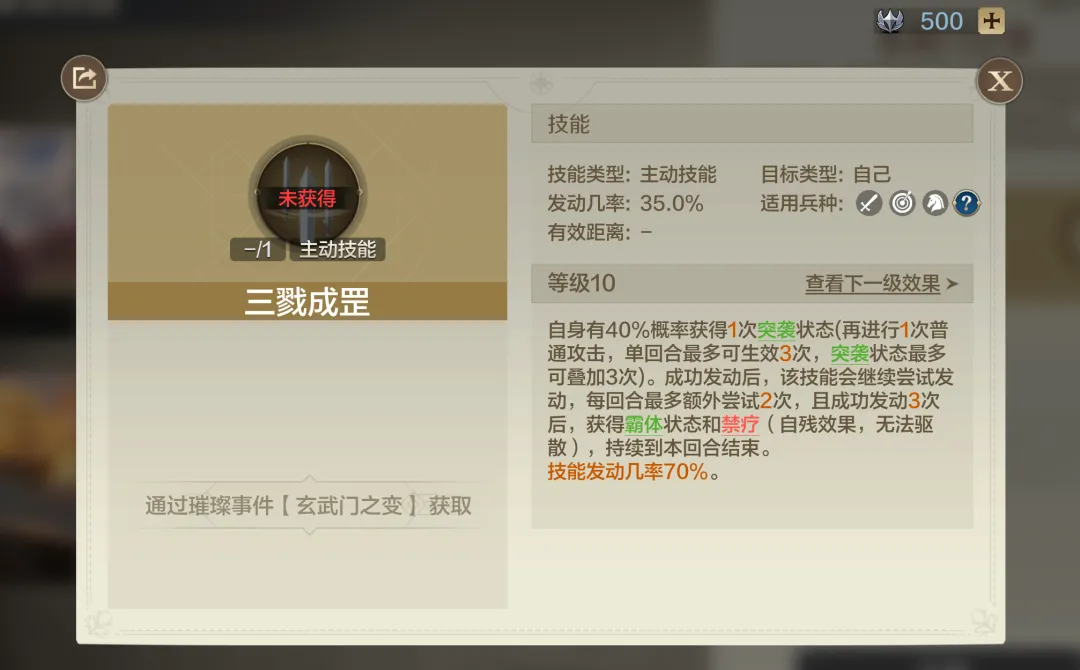 自身有40%概率获得1次突袭状态(再进行1次普通攻击,单回合最多可生效3次,突袭状态最多可叠加3次)。成功发动后,该技能会继续尝试发动,每回合最多额外尝试2次,且成功发动3次后,获得霸体状态和禁疗(自残效果,无法驱散),持续到本回合结束。技能发动几率70%。