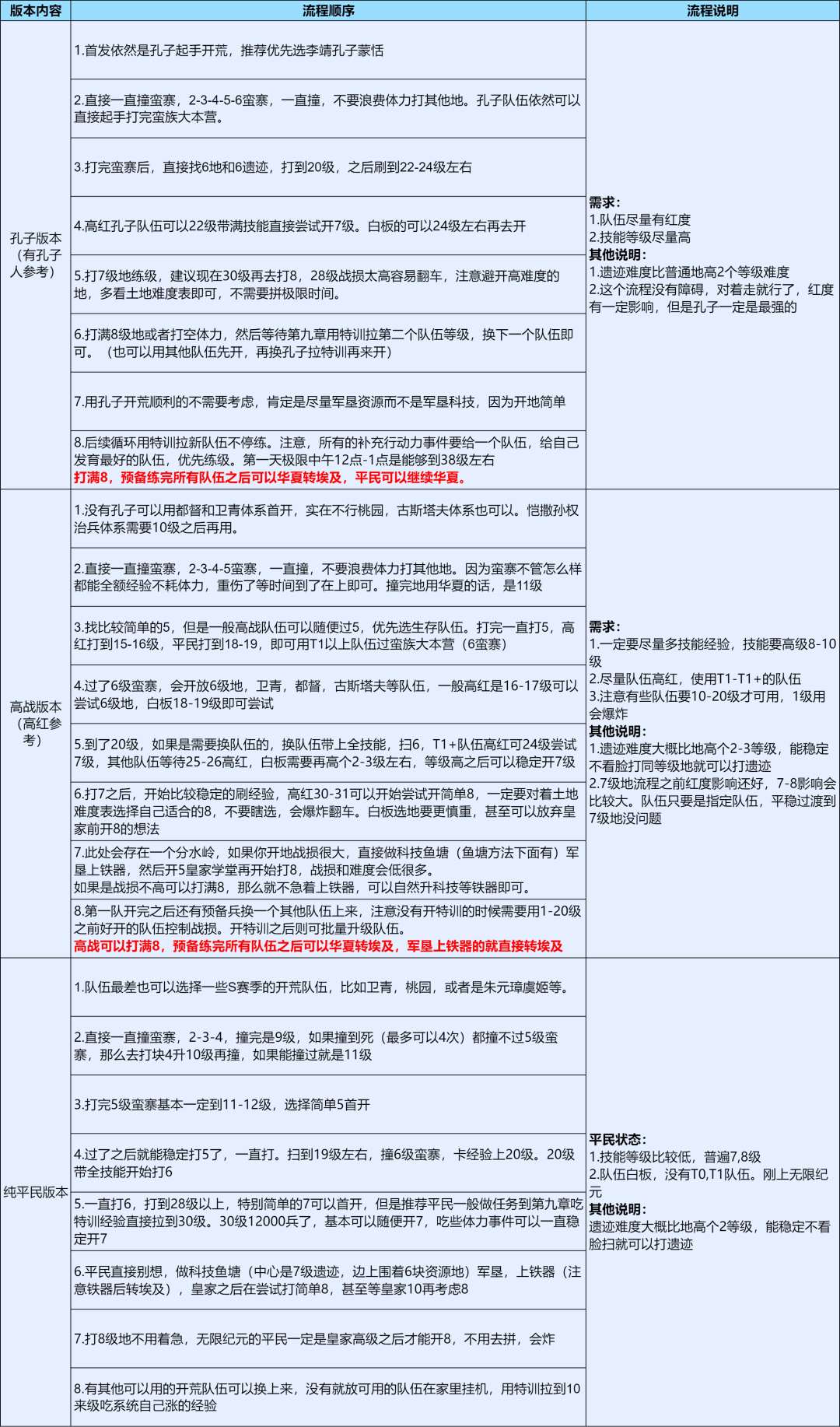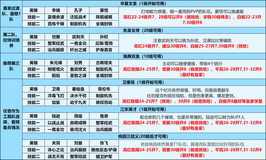 以目前开荒难度来说,高战共存3队即可,平民1-2队即可,其他队伍没有预备兵练级打8,扫7级地或者挂机吃训练即可,推荐优先练下面前三队,剩下队伍量力而行即可,作为工具人辅助即可。