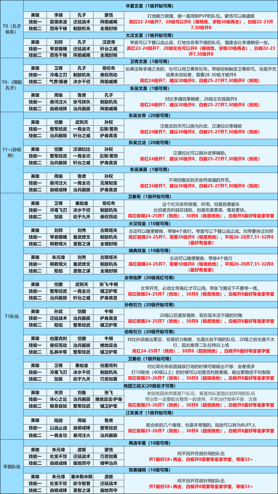 1、孔子依然为T0,只有孔子能够在30级前越级打8,30级之后比较稳健无损打8;