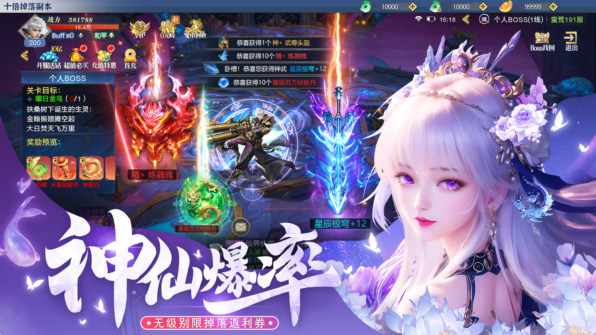 每日0:05准时开服!游戏福利多多:开局只有绑玉?我们直接送钻石!福利界面直接输入钻石兑换码领取。进服要开特权?我们直接送VIP!登录游戏点击vip领取即可获得。骑坐骑跑的慢?我们直接送腾空系统,御剑飞行,探索全图。没时装不好看?我们直接送限量时装,战力外貌我全都要。游戏特色:【腾云驾雾】自由度超高的3D仙侠手游,全图飞行。【绝世武功】御剑术,缚龙决,凌波浩渺,金刚不坏等你来悟。【仙宠助战】盘丝大仙出战,战力翻倍。【百变装备】独特无级别成长武器,不肝不氪轻松获得
