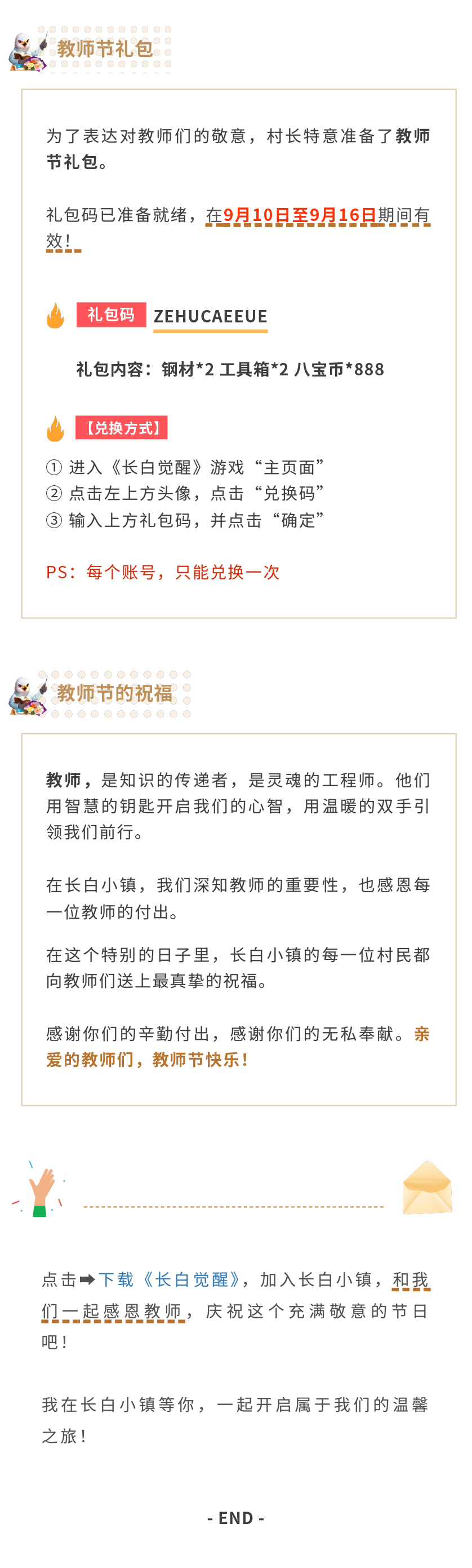 教师节来袭,长白觉醒感恩礼包码大放送~