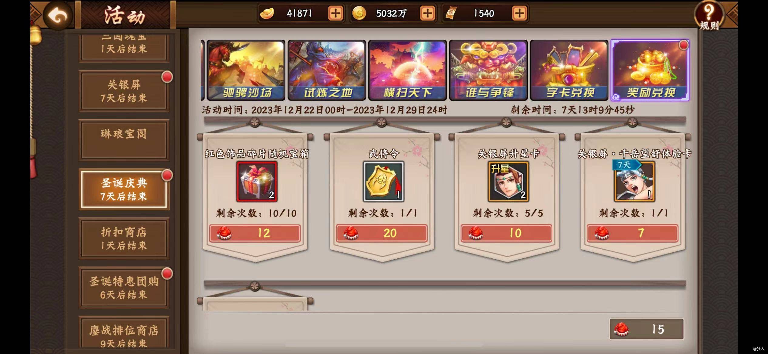 10、圣诞庆典,礼从天降、驰骋沙场(等普通双倍结束后24号再发力来做,之前一天3把即可)、试炼之地(每天至少3把,买一次)、横扫天下、谁与争锋(每天至少3把,买一次)活动尽量做满次数,字卡兑换(神剑没满换陨铁,其他换宝石碎片即可),奖励兑换兑换顺序:武将令>关银屏升星卡>红色饰品碎片随机宝箱>圣诞快乐宝箱>关银屏皮肤体验卡