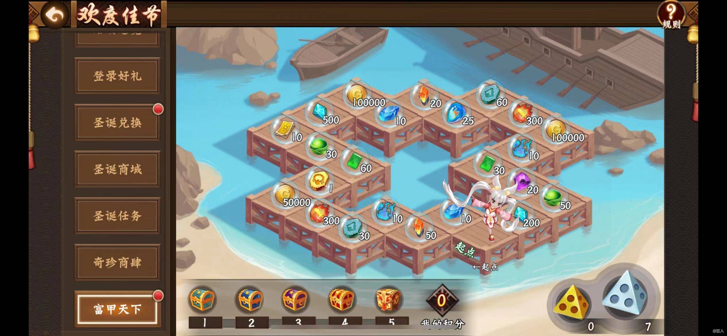 2、富甲天下,类似大富翁滚骰子游戏,每完成一轮可以领取一个宝箱,金骰子要选4,不要在意格子奖励,要在活动期间完成5轮,如果金骰子不够需要在圣诞商城购买(80元宝一个)