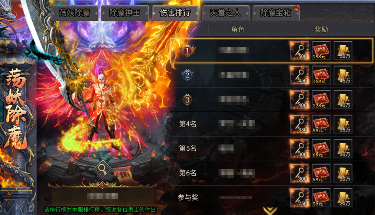 伤害排名奖励根据本服玩家造成的总伤害进行排名,未上榜的可领取参与奖励,人人都有参与奖保底!