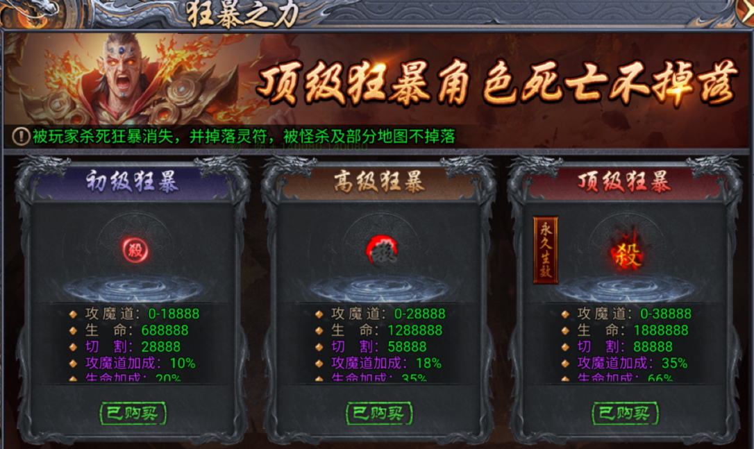 初级狂暴、高级狂暴需要消耗灵符激活,若被其他豪侠击败,狂暴之力将会消散。